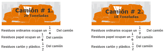 1. ¿A cuántas toneladas de basura equivale cada uno de los tipos de residuos del camión 1 y el camión 2? (Realizar los procedimientos)