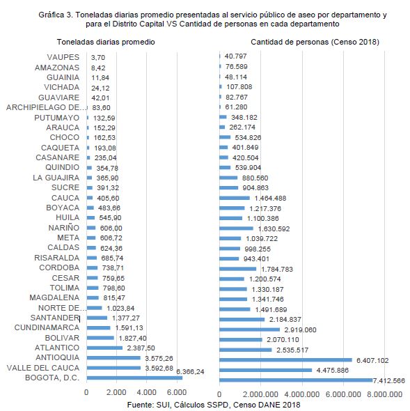 Por otra parte, los 4 departamentos que menos reportan toneladas dispuestas son Vaupés (3,70 Ton/día, 0.01%), Amazonas (8,42 Ton/día, 0.03%), Guainía (11,84 Ton/día, 0.04%) y Vichada (24,12 Ton/día 0,08%). Estos departamentos no alcanzan a representar el 2% del total de los residuos dispuestos diarios del país.
