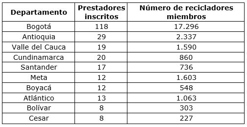 Los departamentos en donde laboran la mayor parte de los aprovechadores de residuos son Bogotá, Antioquia, Meta, Valle del Cauca y Atlántico.