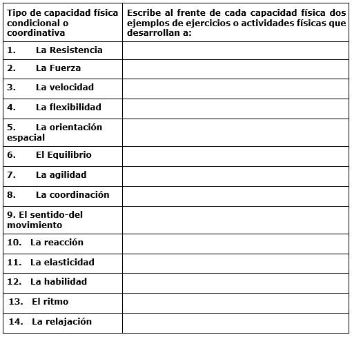 1. Escribe en tu cuaderno cada uno de los conceptos anteriores, y en la siguiente gráfica coloca un ejemplo de una actividad física relacionada con esa capacidad física condicional o coordinativa.
