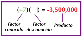 La deuda se presentará como una cantidad negativa, o sea, -3,500,000 y los siete pagos como +7. De manera que la situación se puede representar así: (+7) (x) = -3,500,000, donde x es la cantidad que se desea conocer. Esto es, una multiplicación en la que se desconoce un factor, pero se tiene el otro factor y el producto de ambos.